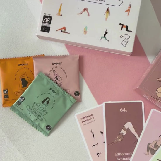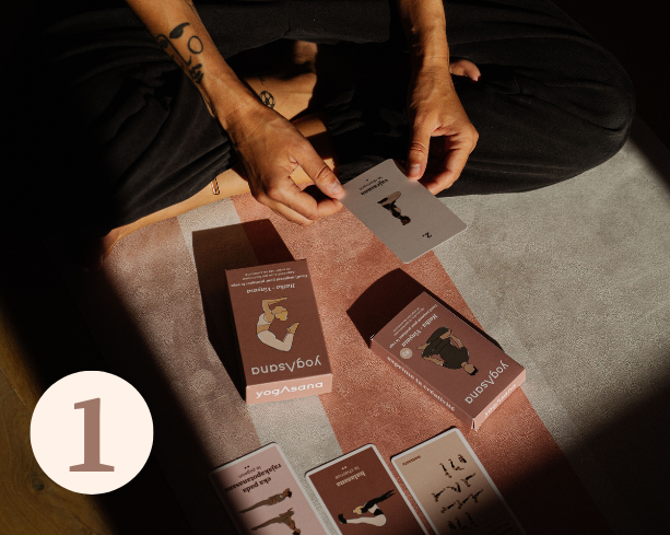 Utilisez le jeu de cartes ; piochez au hasard ou composez une séquence selon vos besoins. Enchaînez les postures avec attention, synchronisez vos mouvements avec votre respiration.